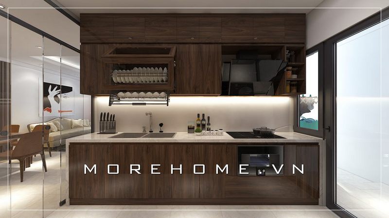 Thiết kế phòng bếp hiện đại với nội thất gỗ tự nhiên đơn giản, tiện nghi cho nhà chung cư
