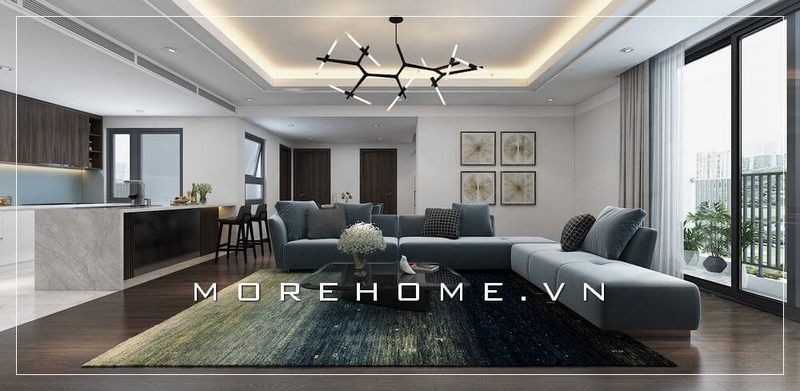 Bộ sofa chữ L màu xanh ghi tạo điểm nhấn nổi bật trong mẫu thiết kế phòng khách chung cư sang trọng này.
