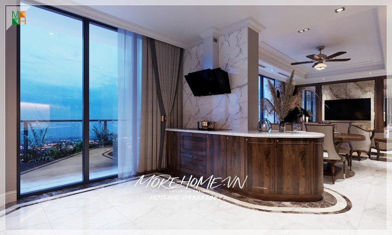 Mẫu bàn đảo bếp gỗ tân cổ điển, với mặt bàn ốp đá trắng vân mây cao cấp, sẽ tạo nên không gian tiện nghi cho người đầu bếp.