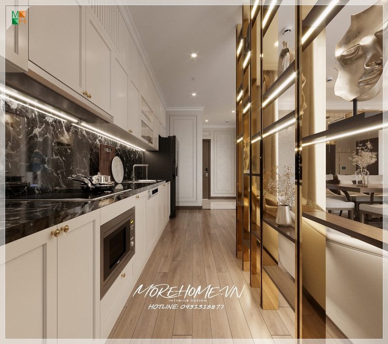 Nội thất phòng bếp của chung cư là một sự kết hợp giữa phong cách tân cổ điển và sang trọng, cùng với nhiều tiện nghi.