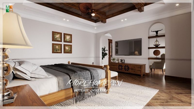 Giường Master của chúng ta được thiết kế sang trọng và đẳng cấp với khung giường gỗ óc chó chủ đạo. Màu trầm ấm của gam đã tạo nên một nét đồng bộ cho không gian căn phòng.