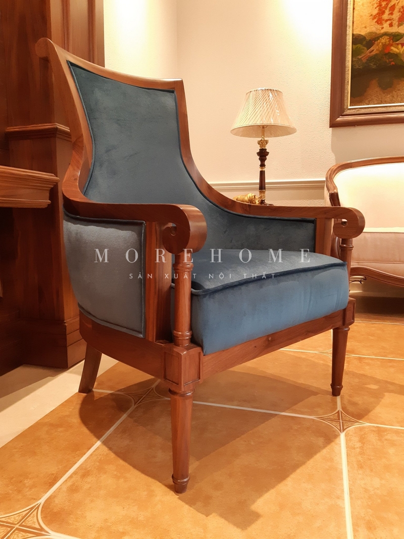 Thi công sofa đơn khung gỗ óc chó bọc nỉ màu xanh coban tân cổ điển đường nét mềm mại, nét chạm khắ tỉ mỉ tinh xảo từ thờ lành nghề tại nội thất Morehome