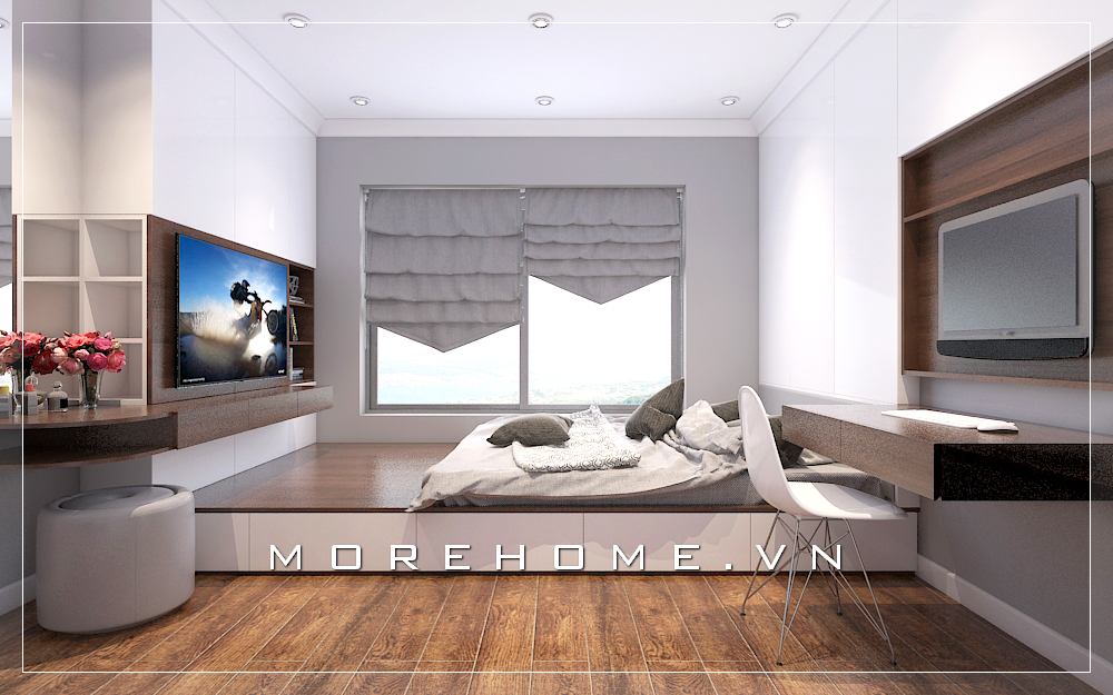 Trang trí nội thất phòng ngủ chung cư ấn tượng với giường ngủ gỗ công nghiệp màu trắng ấn tượng
